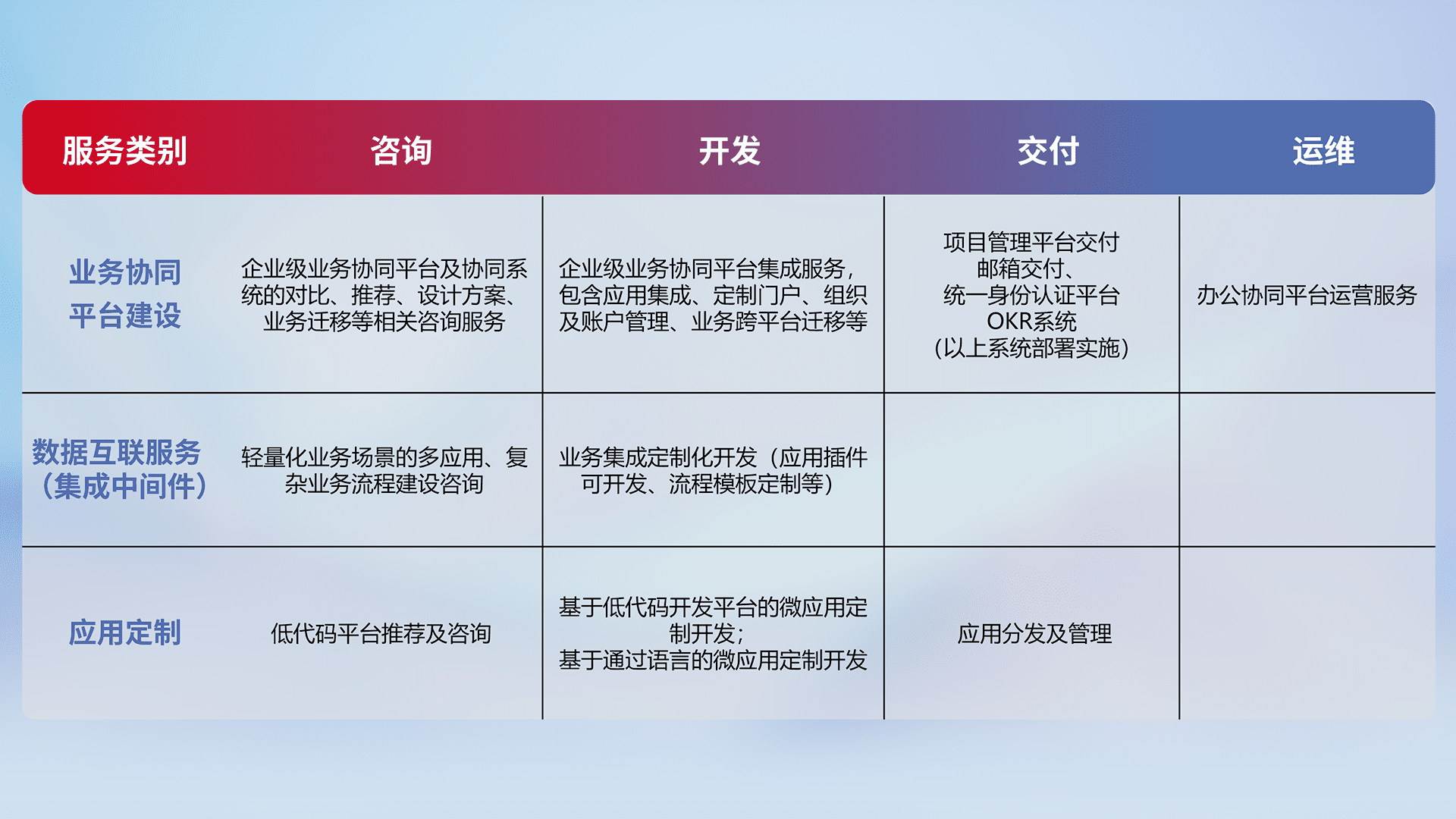 针对钉钉、、企微、、IDaas等平台级产品提供产品的规划、、、、方案、、、、交付、、、定制化开发等服务,,,实现如统一协同办公、、、、智能客户服务、、、混合会议管理、、、智能数据查询、、、、等业务场景,,,实现数字化转型。。