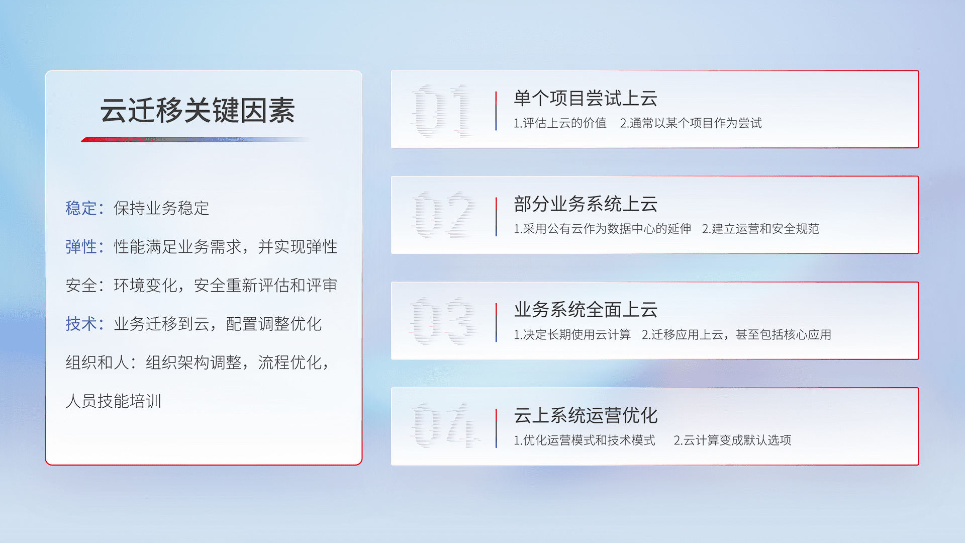 结合实际业务,,,,从规划设计、、、云平台选型、、云原生改造、、数据迁移、、、、集成交付,,,,迁移全过程为客户识别最佳上云路径,,,做好风险识别管理,,,设计网络架构、、身份权限、、、、安全审计合规、、操作审计、、、、日志审计、、监控告警策略、、、多站点容灾设计等,,,,对云上基础设施进行整体规划,,,提升IT治理水平,,,,以满足弹性、、、高可用、、高性能的需求。。。