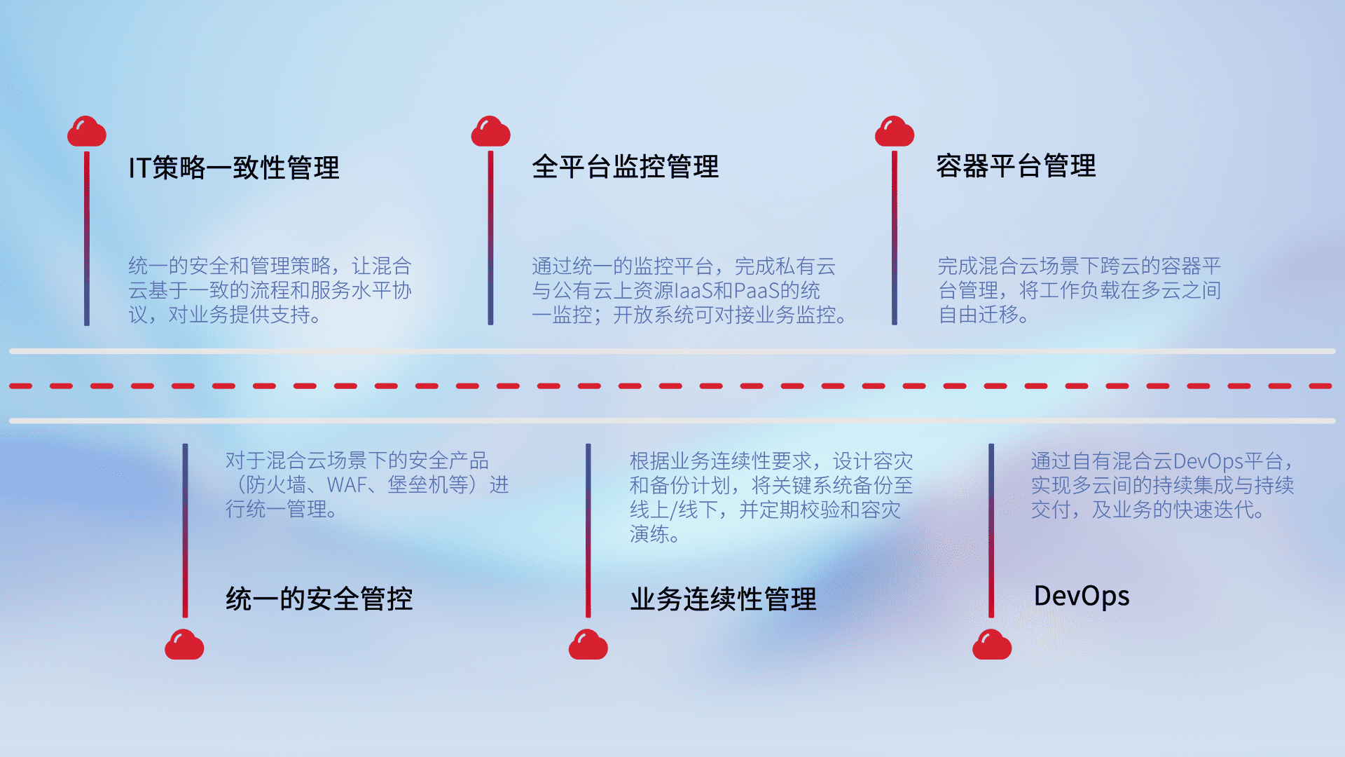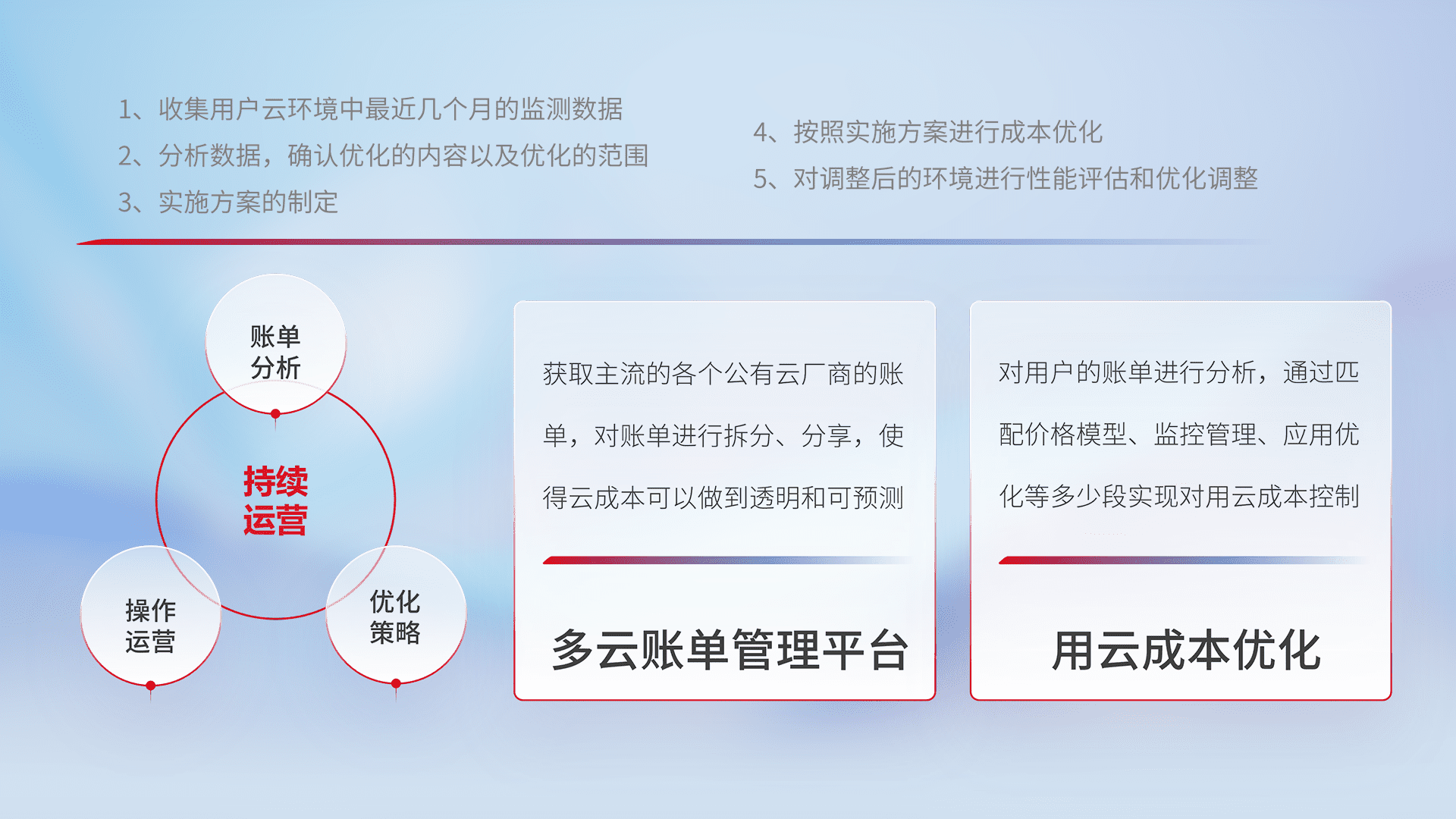 通过多云纳管,,以统一的资源数据模型把客户的云资源进行抽象和封装,,进而实现对多云资源的统一操作,,,,保障云资源管理的可靠性、、、、稳定性与可用性。。量身定制化运维内容,,,,配置、、、、开发运维、、补丁管理、、、、备份、、、、监控、、认证和访问管理、、、、审计和日常巡检等,,,保障在用云过程中的可靠度,,,稳定度以及高可用率。。。。